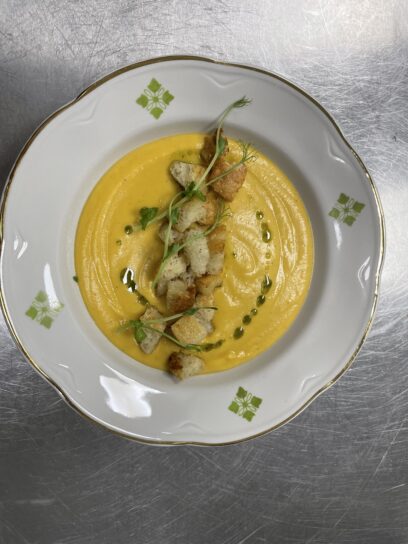 Vēlāk galdā tiks celti muižas iecienītākie ēdieni – marinēta krāsnī cepta paipala, ķirbju krēmzupa, muižas soļanka, pamatēdienā cūkgaļas ribiņas BBQ – burbona glazūrā, meža sēnes saldajā krējumā, saldajā katru dienu cits piedāvājums.