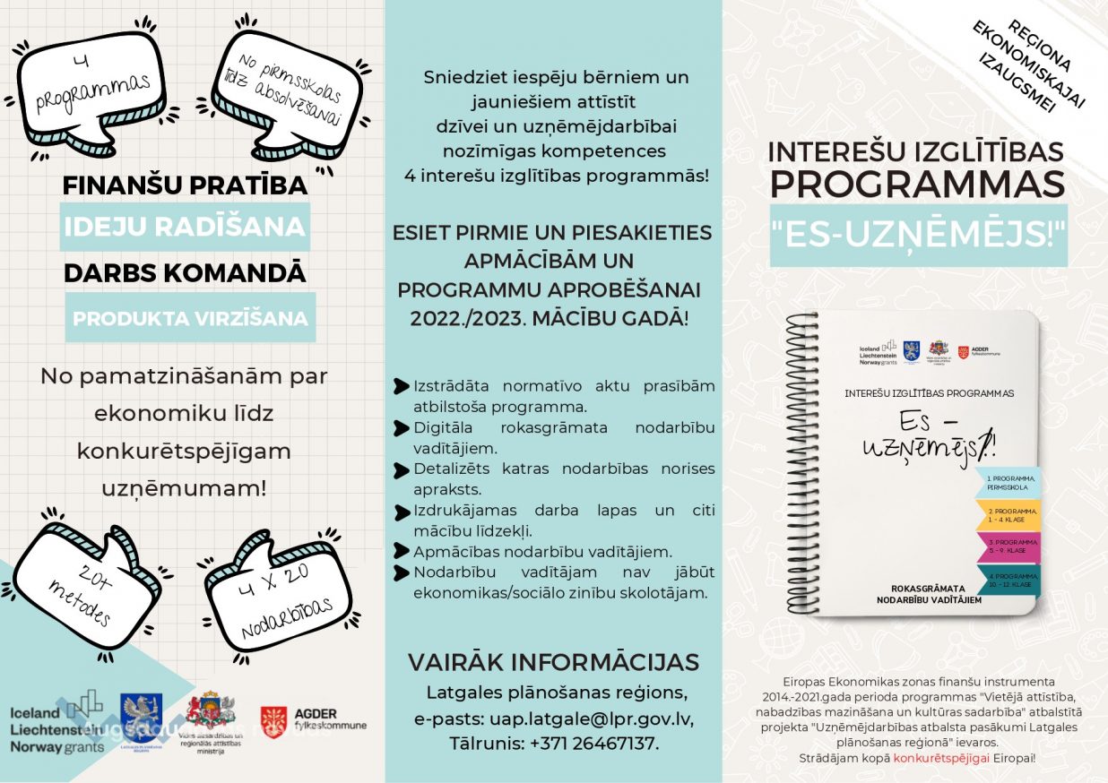 Kopš šī gada marta LPR īstenotā Eiropas Ekonomikas zonas grantu projekta ”Uzņēmējdarbības atbalsta pasākumi Latgales plānošanas reģionā” aktivitātes ietvaros tiek izstrādātas 4 atsevišķas, savstarpēji papildinošas interešu izglītības programmas. Tās paredzētas dažādiem vecumposmiem – pirmsskolas vecuma bērniem, 1.- 4. klases vecuma bērniem, 5.- 9. klases vecuma bērniem un vidusskolas posma jauniešiem.