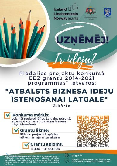 2022. gada 1. aprīlī Latgales plānošanas reģions ir izsludinājis pieteikšanos EEZ grantu 2014.–2021. gada perioda programmas “Vietējā attīstība, nabadzības mazināšana un kultūras sadarbība” atklātā projektu konkursā “Atbalsts biznesa ideju īstenošanai Latgalē”, kur būs iespēja saņemt atbalstu uzņēmējdarbības attīstībai līdz 2024. gadam, īstenojot jaunas biznesa idejas un radot darba vietas Latgales reģionā.