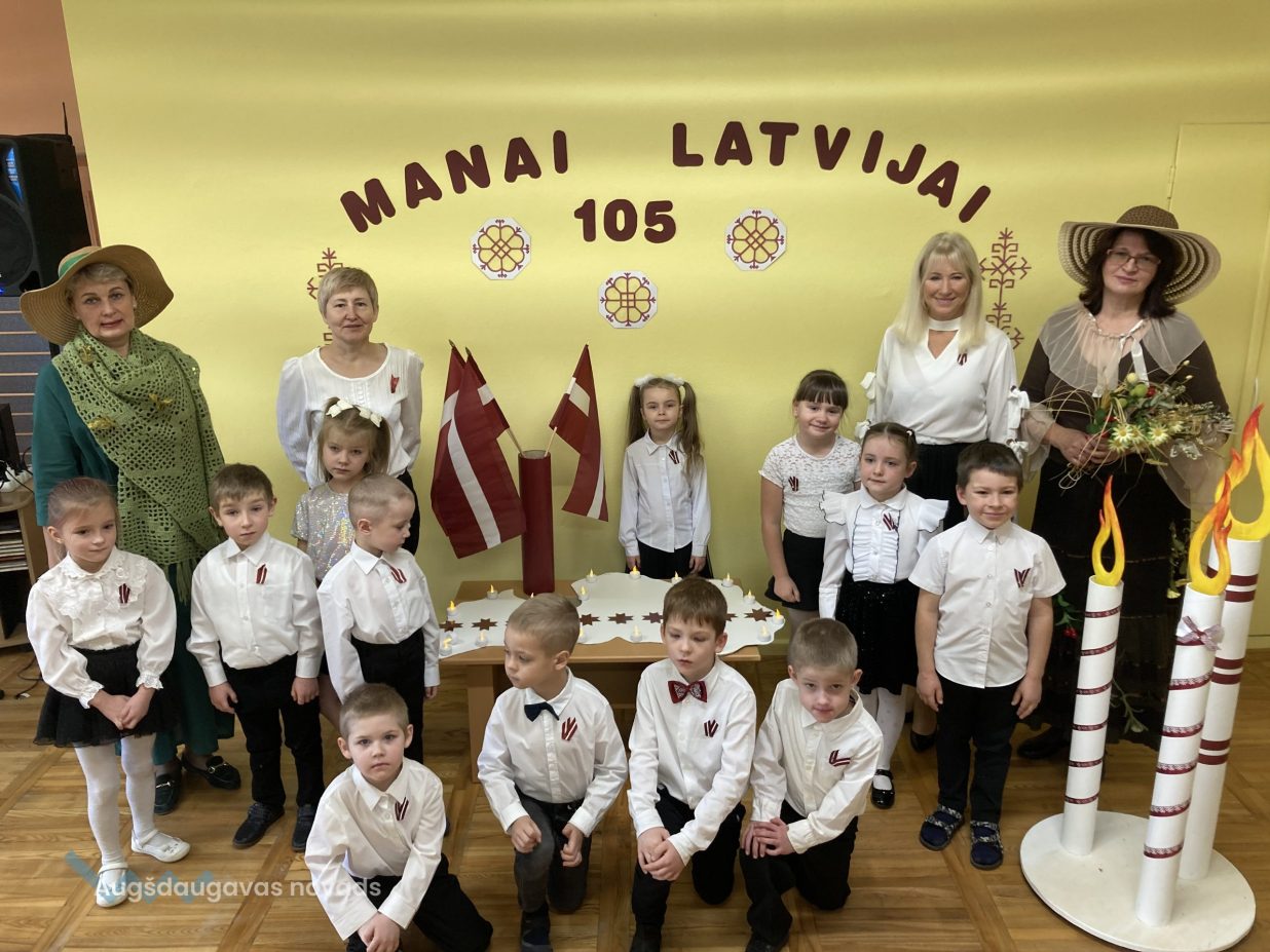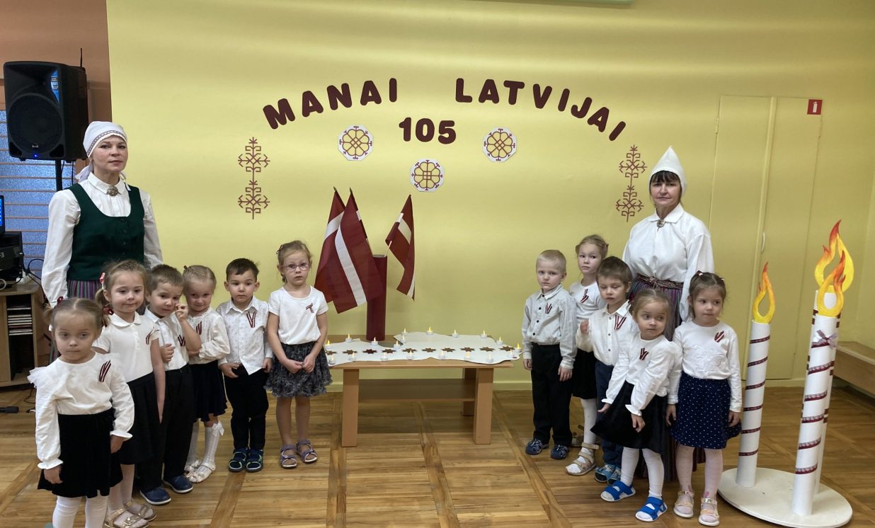 Kā ikkatru gadu novembris Ilūkstes PII “Zvaniņš” atnāca patriotiskās noskaņās. Ar gaismas, siltuma, mīlestības piepildītām domām un laimes vēlējumiem savai dzimtenei mūsu pirmsskolas iestādes bērni no “Skudriņu”, “Zīļuku”, “Saulīšu”, “Ežuku”, “Lācēnu”, “Bitīšu”, ”Ābolīšu”, “Zaķēnu” un “Rūķīšu” grupiņām gatavojās mūsu Latvijas 105. gadadienai. Ik dienas rotaļnodarbībās mazie ķipari izstaigāja dzimtenes teritorijas kontūrkartē- iepazina pilsētas, upes, ezerus, dzīvo radību, krāšņās dabas ainavas, kultūru, simboliku un tradīcijas. Grupiņās tika veidoti radošie darbiņi, veltīti mūsu tēvzemei.
