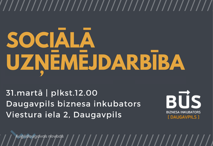 Daugavpils biznesa inkubators rīko lekciju par sociālo uzņēmējdarbību, kuru vadīs Andra Jurgelāne (Liepājas biznesa inkubators). Lekcijas laikā jūs uzzināsiet par sociālo uzņēmējdarbību, kāpēc tā kļūst populāra, kādi piemēri ir pasaulē un Latvijā, kā arī par atbalsta iespējām.
