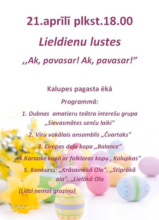 Lieldienu lustes Kalupē07.04.2017AKTUĀLI 21. aprīlī plkst. 18.00 Kalupes pagasta pārvalde aicina iedzīvotājus uz Lieldienu lustēšanos- dziedāšanu, dancošanu, spēlēšanu. Līdzi ņemot groziņu un skaistākās, stiprākās olas konkursam.