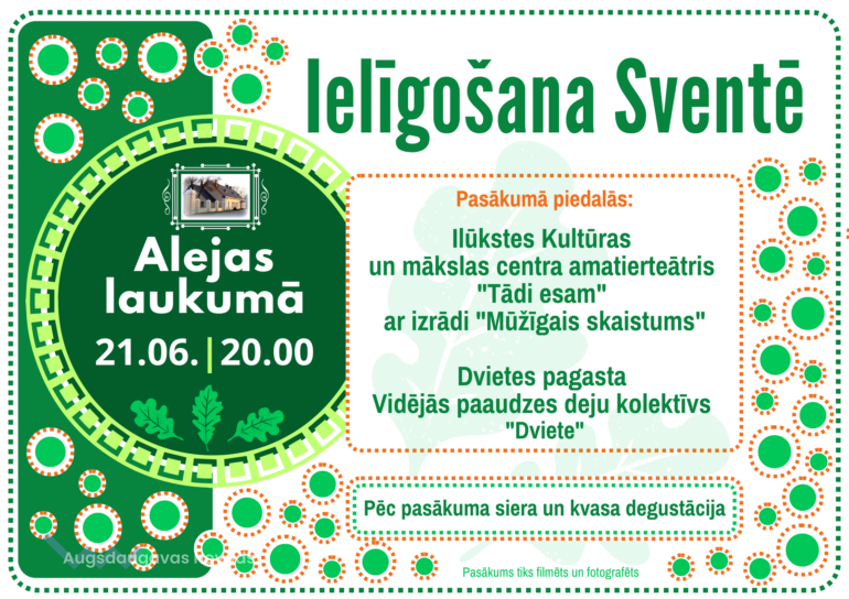 21. jūnijā 20.00 Sventes ciema Alejas laukumā Jāņu ielīgošana kopā ar Ilūkstes Kultūras un mākslas centra amatierteātri “Tādi esam”. Koncerts, cienasts, ugunskurs, mūzika.