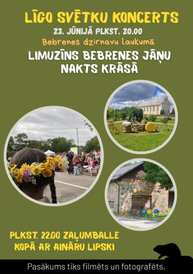 23. jūnijā 20.00 Bebrenes dzirnavu laukumā “Limuzīns Bebrenes Jāņu nakts krāsā’’. 22.00 Bebrenes dzirnavu zaļumballe Aināra Lipska izpildījumā.