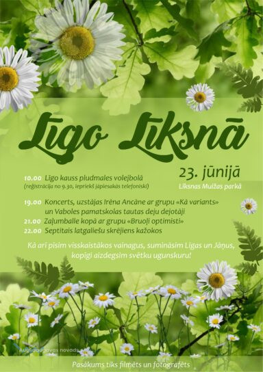 23. jūnijā Līksnā 10.00 Līgo kauss pludmales volejbolā (reģistrācija 9.30-10.00), 19.00 svētku koncerts, 21.00 balle, 22.00 septītais latgaliešu skrējiens kažokos.