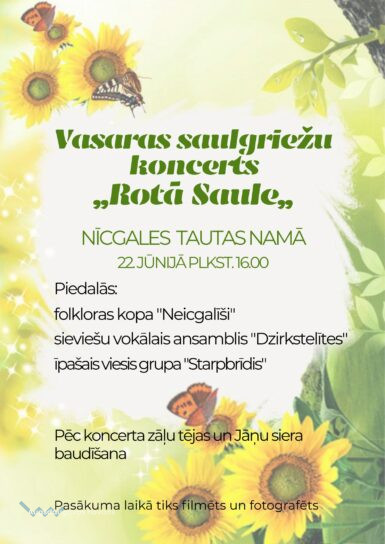 22. jūnijā 16.00 Nīcgales Tautas namā saulgriežu ieskandināšanas koncerts "Rotā saule!".