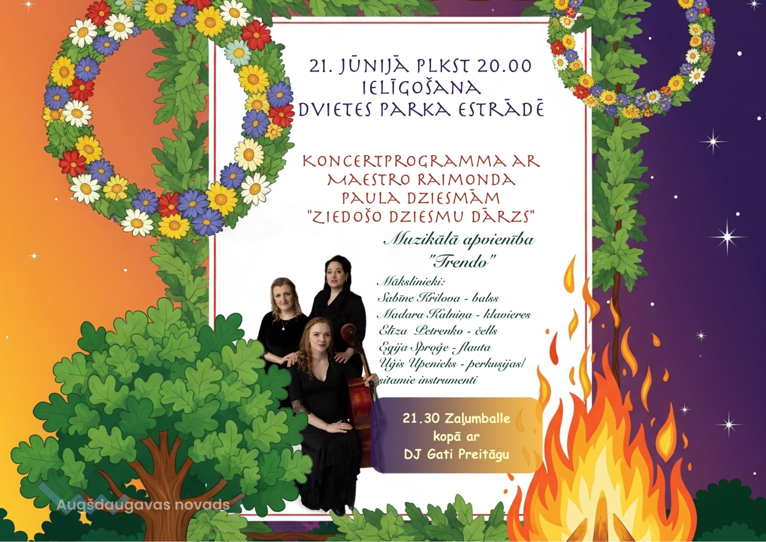 21. jūnijā 20.00 Ielīgošana Dvietes parka estrādē, 21.00 diskoballe ar DJ Gati.