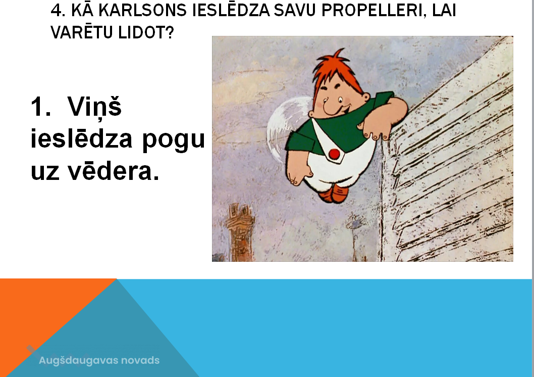 Lāču pamatskolas 4. klases izglītojamie jau iepriekš lasīja un iepazina grāmatu un multfilmu par Karlsonu. Bibliotekārā stundas sākumā A. Kardele pastāstīja par A. Lindgrēnas dzīvi, slavenākām grāmatām un to, kā radās idejai grāmatai par Karlsonu. Tad S. Kardele uzdeva skolēniem mīklas par to, kas garšo Karlsonam. Tālāk vadītājas izlasīja fragmentus no grāmatas “Brālītis un Karlsons, kas dzīvo uz jumta” par Karlsona palaidnībām. Kopā ar bērniem vadītājas pārrunāja, kāds raksturs ir Karlsonam un kāds – Brālītim. Tad pienāca laiks pārbaudīt savas zināšanas atbildot uz viktorīnas jautājumiem. Izglītojamie bija zinoši visos sīkumos un pareizi atbildēja uz jautājumiem. Literārās stundas izskaņā tika spēlēta spēle, kurā katrs skolēns izvēlējās vienu no kartiņām un izpildīja uzdevumu. Skolēni trenējās veiklībā, pieskaroties kāju pirkstiem, dejojot, skrienot, lecot, zīmēja ar aizvērtām acīm to, kas patīk Karlsonam, minēja mīklas.
