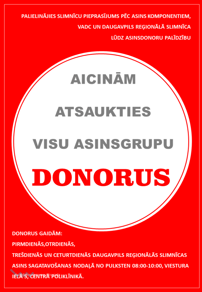 Pirms došanās nodot asinis, lūgums uzzvanīt un pieteikties pa tālruni: 65405323