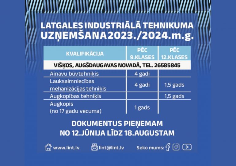 Vairāk informācijas par uzņemšanu var meklēt Latgales Industriālā tehnikuma mājaslapā: www.lint.lv vai zvanīt 26585845