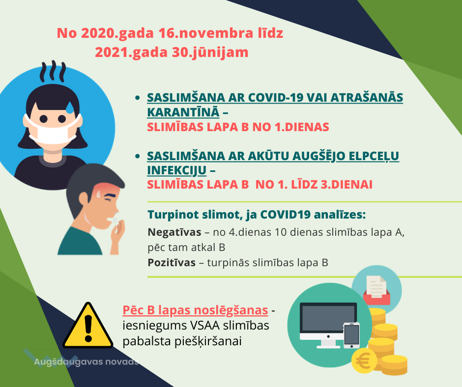 Personām, kurām no 2020.gada 16.novembra līdz 2021.gada 30.jūnijam darbnespēja tiks noteikta sakarā ar akūtu augšējo elpceļu infekciju, ārsts izsniegs darbnespējas lapu B par periodu no slimības pirmās līdz trešajai dienai. VSAA par pirmajām trim dienām piešķirs slimības pabalstu 80 procentu apmērā no pabalsta saņēmēja vidējās apdrošināšanas iemaksu algas.