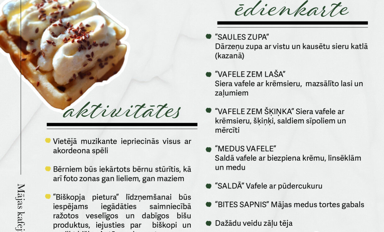Adrese: Alejas iela 2, Medumi, Augšdaugavas nov. Kontakti: 27095164 Anita Drozdova Darba laiks: 15.00 – 19.00 Ēdienkarte: Saules zupa, Vafele zem laša, Vafele zem šķiņķa, Medus vafele, vafele Saldā, medus torte Bites sapnis, dažādu veidu zāļu tējas.