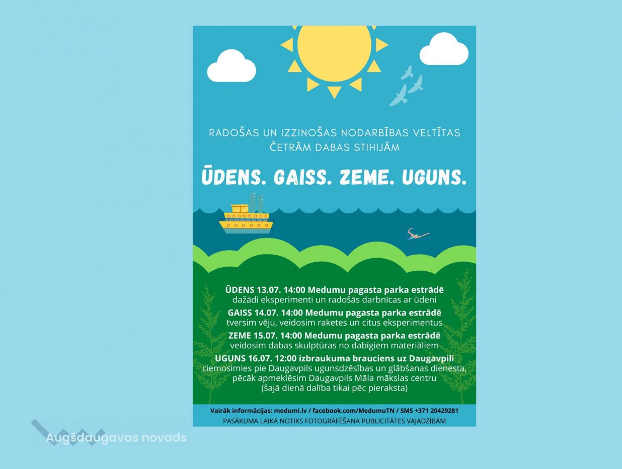 ŪDENS - 13.07. 14:00 Medumu pagasta parka estrādē notiks dažādi eksperimenti un radošās darbnīcas ar ūdeni.