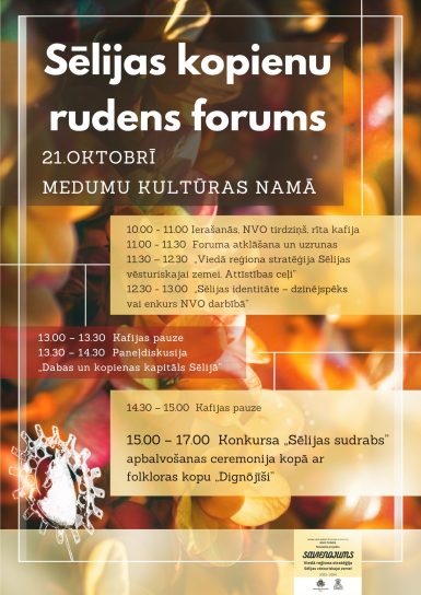 21. oktobrī Medumu pagasta tautas namā trešajā Sēlijas nevalstisko organizāciju forumā pulcēsies nevalstisko organizāciju un lauku kopienu līderi. Bet foruma otrajā daļā notiks konkursa “Sēlijas sudrabs” apbalvošanas ceremonija.