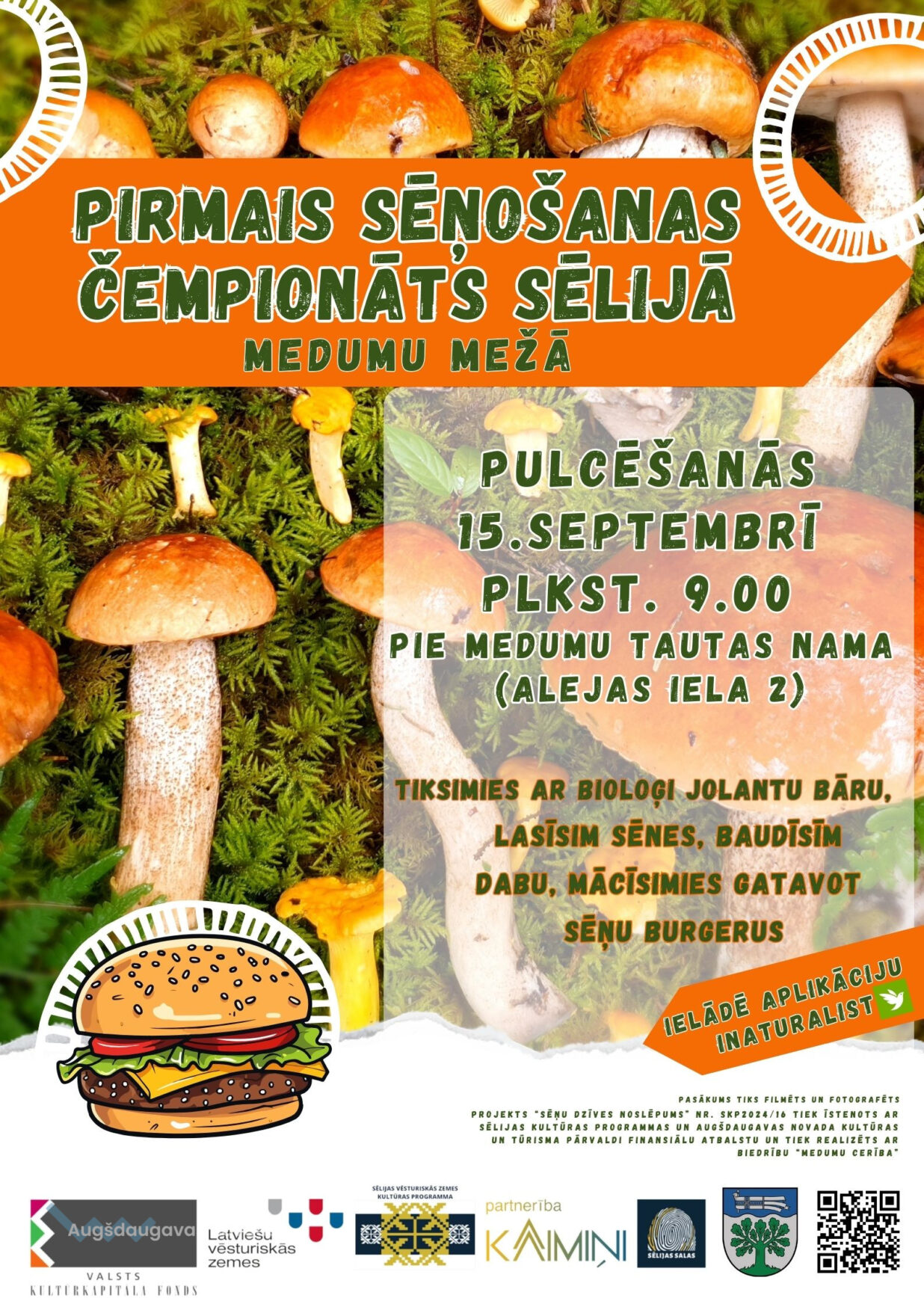 15. septembrī notiks Pirmais Sēņošanas čempionāts Sēlijā, Medumu pagasta mežā ar mērķi popularizēt sēņošanu un sniegt iespēju ģimenēm arvien vairāk laika pavadīt mežā, veicinot ģimeņu tradīciju uzturēšanu. Tiekamies plkst. 9.00 pie Medumu Tautas nama zābakos, ar groziem un labu noskaņojumu! Visi kopā, ar savu transportu, brauksim uz starta punktu. Kam nav transporta, būs iespēja apvienoties.