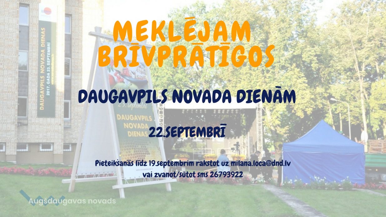 Daugavpils novada jaunatne meklē 6 brīvprātīgos Daugavpils novada dienām, kas norisināsies 22.septembrī Daugavpilī. Brīvprātīgo pienākumos ietilpst aktivitāšu vadīšana jaunatnes teltī, kā arī organizatoru uzdoto uzdevumu pildīšana. Pieteikties iespējams rakstos uz milana.loca@daugavpilsnovads.lv, zvanot 26793922, vai piesakoties misijai portālā www.brivpratigie.lv