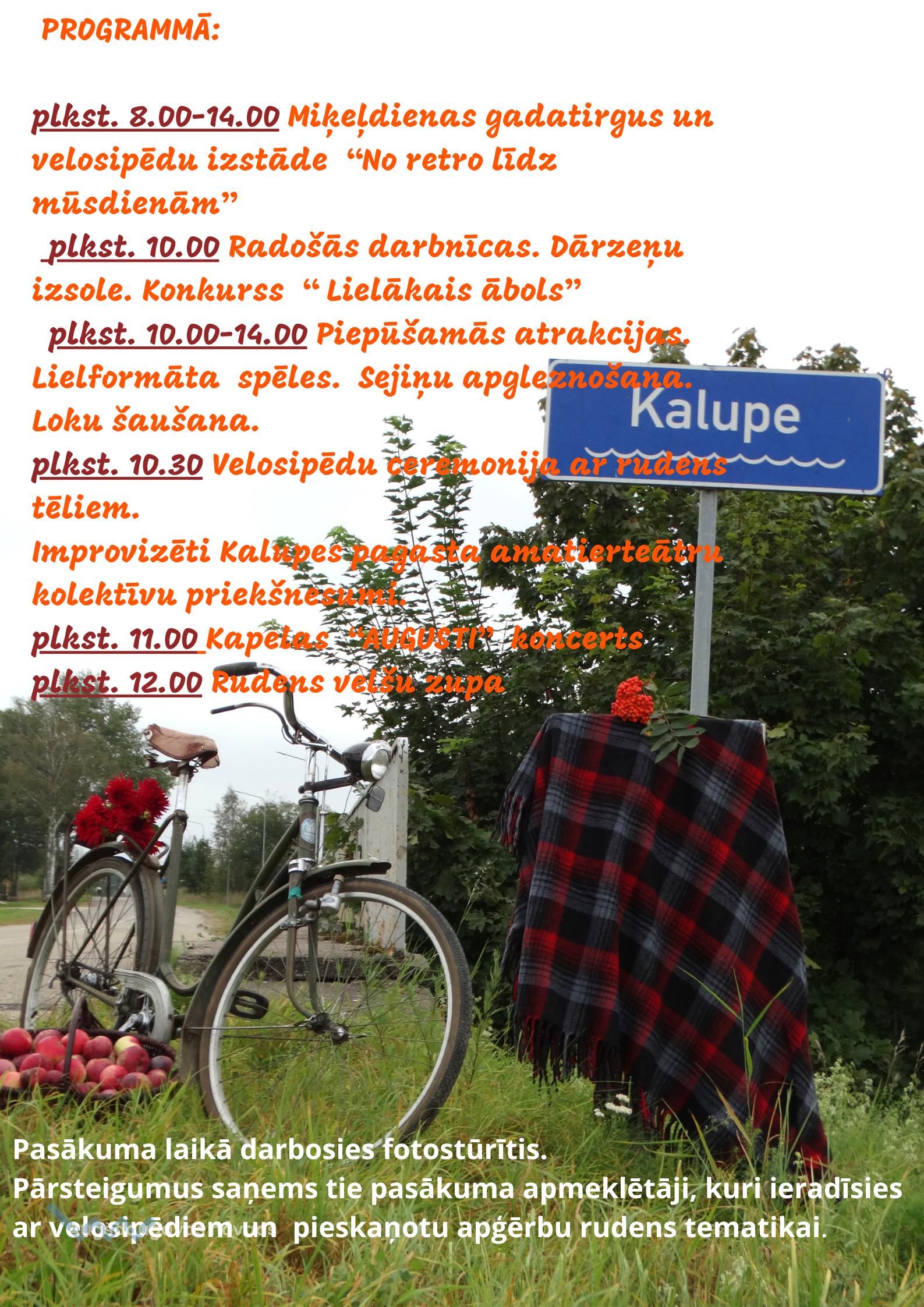 Tirgus laukumā būs apskatāma velosipēdu izstāde “No retro līdz mūsdienām”. Apmeklētājiem, kuri ieradīsies pasākumā ar velosipēdiem, gaidīs pārsteigums un iespēja piedalīties “Velosipēdu un rudens tēlu ceremonijā”.
