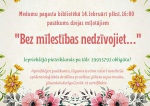 14. februārī plkst. 16.00 Medumu pagasta bibliotēkā norisināsies pasākums dzejas mīļotājiem “Bez mīlestības nedzīvojiet”.