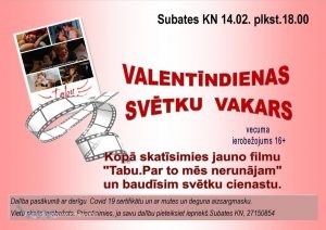 Subates kultūras namā tiks arī svinēta Valentīna diena. Par godu tai plkst. 18.00 tiks demonstrēta filma “Tabu. Par to mēs nerunājam”. Viesi arī varēs baudīt svētku cienastu.