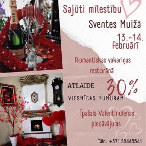 13.-14. februārī Sventes muižā ir īpašais Valentīndienas piedāvājums – romantiskas vakariņas restorānā un 30% atlaide viesnīcas numuram. Tālr. uzziņām: +371 28445541.