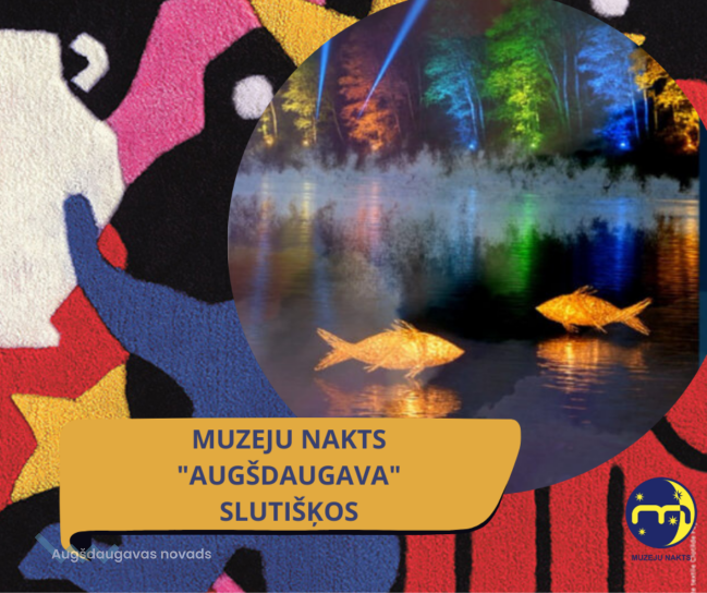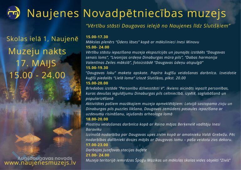 Naujenes Novadpētniecības muzejā Vērtību stāsti Daugavas ielejā no Naujenes līdz Slutišķiem 15.00-17.30 Mākslas plenērs “Ūdens lāses” 15.00-19.30 Papīra kuģīšu darbnīca, dalība loterijā “Lielais loms” (izloze 20.00 Latgales sētā, Slutišķos) 15.00-20.00 Brīvdabas izstāde “Personību dzīvesstāsti V”, maketa “Daugavas loki” apskate, aktivitātes bērniem 15.00-24.00 Izstādes “Daugavas senais loms”, “Livonijas ordeņa Dinaburgas mūra pils”, “Dabas harmonija Valentīnas Zeiles mākslā”, fotoizstāde “Daugavas ūdeņu atspulgā” 17.00-23.00 Juzefovas stacijas bufete 18.00-20.00 Plostu veidošanas darbnīca, dārza dekora “Zivs” veidošana, izzinoša nodarbība par Daugavas upes zivīm 21.00-24.00 Mirdzošie vides objekti “Zivis”