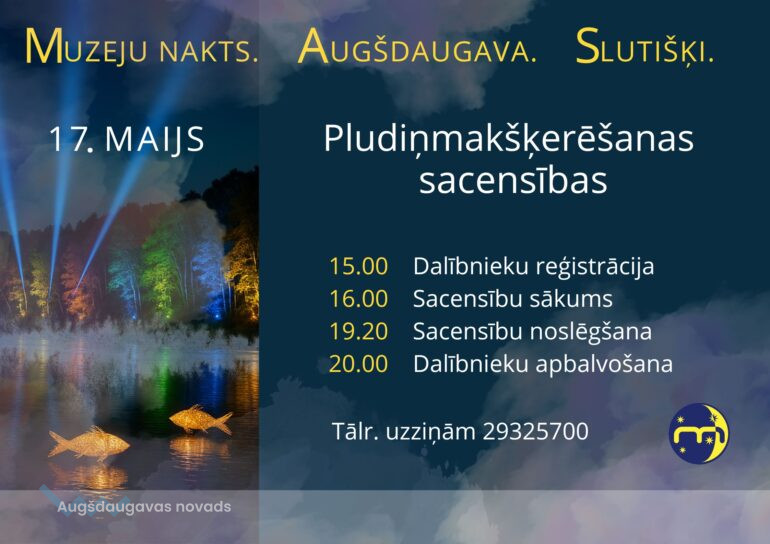 16.00-19.20 Pludiņmakšķerēšanas sacensības (15.00 reģistrācija) *Sacensības notiek 2025. gada 17. maijā, Daugavā, Slutišķos, Naujenes pagastā, Augšdaugavas novadā. Dalība pasākumā bez maksas. Pieteikšanās sacensību dienā 17.05.2025., no plkst. 15.00 līdz plkst. 16.00. Sacensības notiek 2025. gada 17. maijā, Daugavā, Slutišķos, Naujenes pagastā, Augšdaugavas novadā. Dalībnieku reģistrācija plkst. 15.00-16.00. Sacensību sākums plkst. 16.00. Sacensību noslēgšana 19.20. Sacensību dalībnieku apbalvošana 20.00. Rezultātus vērtē divās grupās: 1. bērni līdz 16 gadu vecumam ieskaitot (pieaugušo uzraudzībā) 2. pieaugušie (bez vecuma ierobežojuma) 1.-3. vietas ieguvēji, katrā vecuma grupā tiks apbalvoti ar kausiem un medaļām. Tālrunis uzziņām un konsultācijām 29325700. 18.00-19.00 Kulinārā meistarklase “Garšīgi” ar šefpavāru Ēriku Aleksejevu 18.00-20.30 Radošās darbnīcas (skrubīši, pītie gaismekļi, klūgu zivis), aktivitātes bērniem (lielformāta spēles, darbnīcas, sejiņu apgleznošana u.c.) 20.00 Loterijas “Lielais loms” izloze, makšķerēšanas sacensību dalībnieku apbalvošana 20.30-21.30 Ances Krauzes koncerts 21.30-24.00 “Gaismas loki” - gaismas instalācija pār Daugavu, uguns skulptūras
