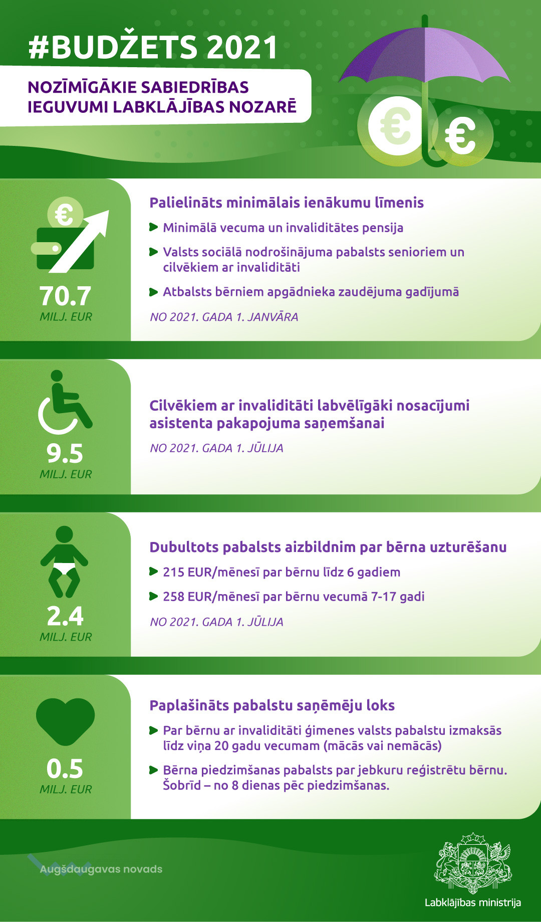 Valsts sociālā nodrošinājuma pabalsts personām ar invaliditāti kopš bērnības pieaugs – 1. grupai no 159,50 līdz 190,40 eiro strādājošiem un līdz 247,52 eiro nestrādājošiem; 2. grupai no 147,23 līdz 163,20 eiro strādājošiem un līdz 195,84 eiro nestrādājošiem; 3. grupai no 122,69 līdz 136 eiro.