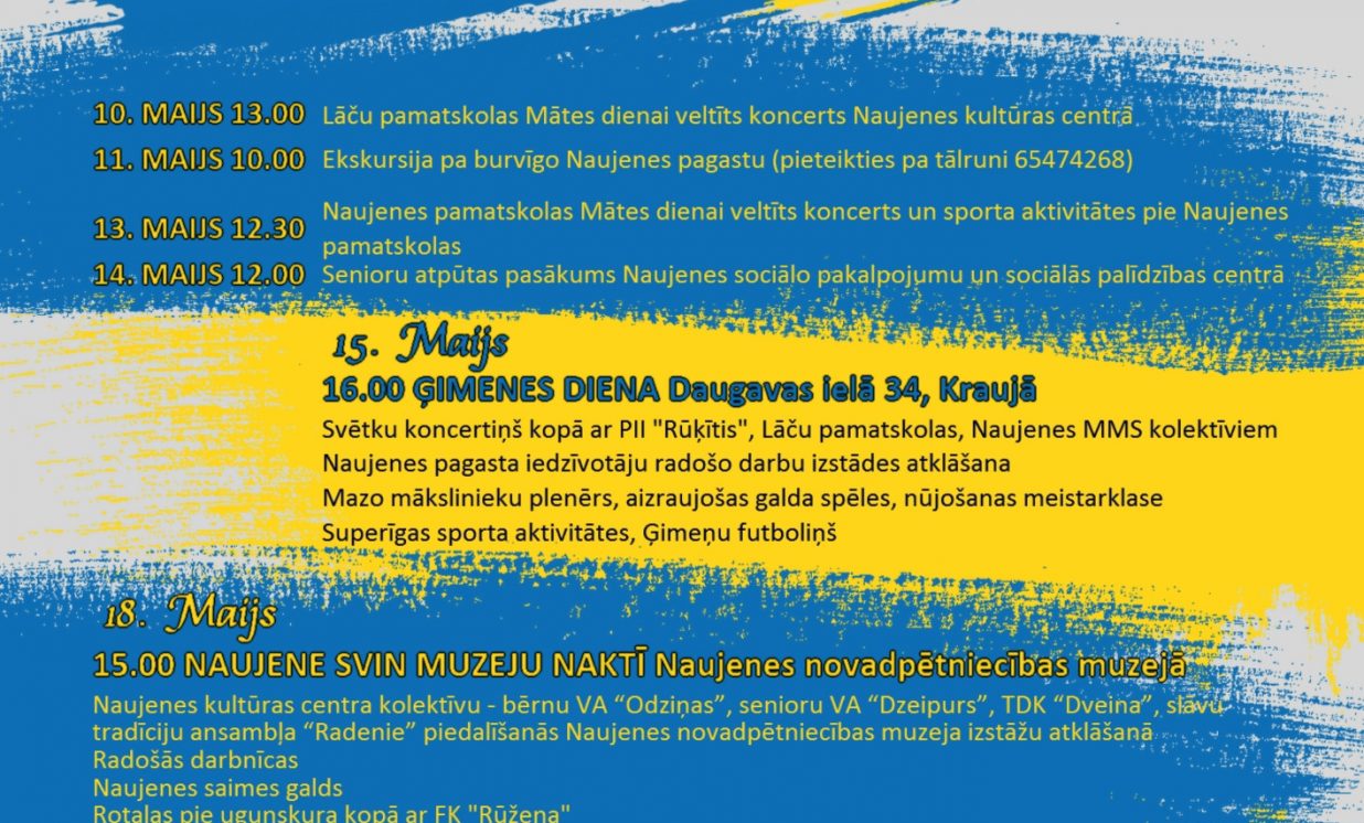 TREŠDIEN 15. MAIJĀ PLKST. 16.00 aicinām visas, visas Naujenes pagasta ģimenes uz Ģimenes dienu! Ģimenēm par godu neliels svētku koncertiņš, kurā uzstāsies Naujenes pirmsskolas izglītības iestādes “Rūķītis”, Lāču pamatskolas un Naujenes mūzikas un mākslas skolas kolektīvi. Daugavas ielā 34, Kraujā (bijušajā Naujenes jaunatnes un sporta centrā) tiks atklāta Naujenes pagasta iedzīvotāju radošo darbu izstāde. Gleznosim Mazo mākslinieku plenērā, spēlēsim aizraujošas galda spēles, piedalīsimies nūjošanas meistarklasē. Kraujas stadionā notiks superīgas sporta aktivitātes un plkst. 17.30 notiks Ģimeņu futboliņa turnīrs – gaidām vecāku un bērnu komandas (īpaši aicinām tētus), pieteikumus gaidām līdz 13. maijam, pieteikties var pa tālruni 22019135.