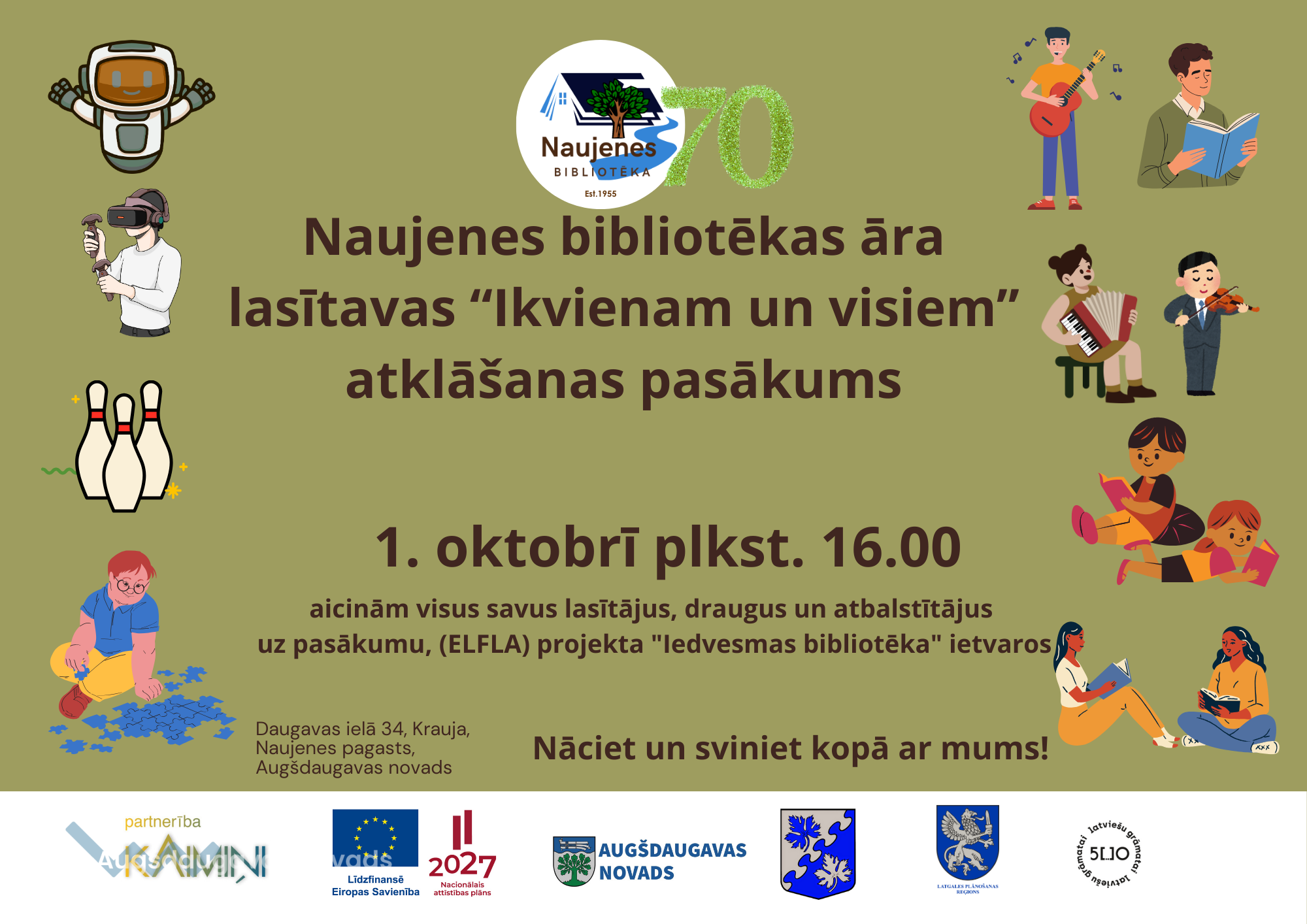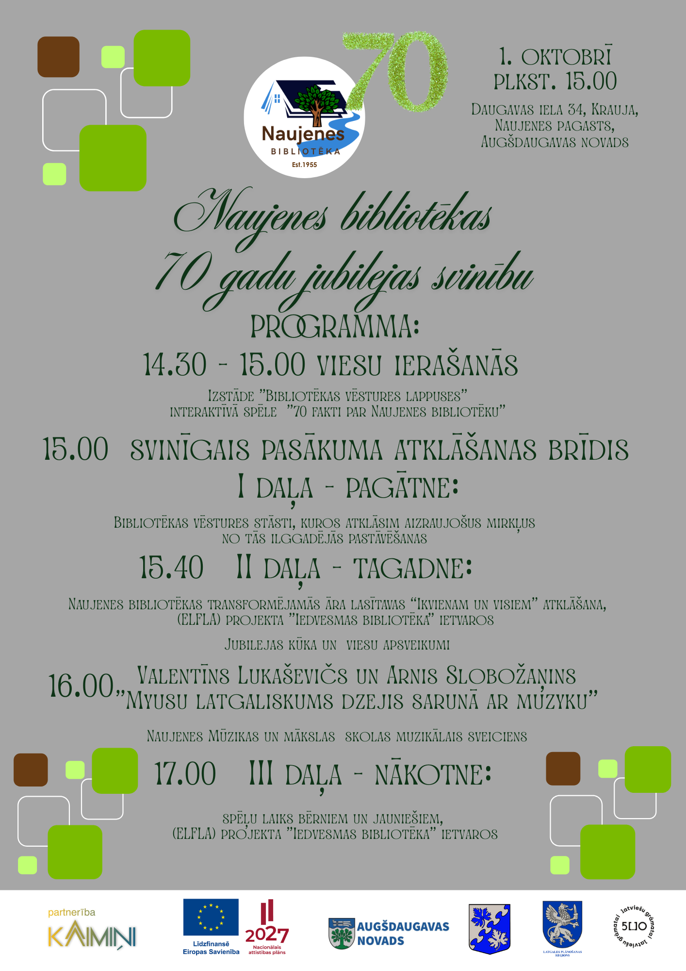 Mīļie lasītāji, draugi un sadarbības partneri! Ar prieku un lepnumu aicinām Jūs uz Naujenes bibliotēkas 70 gadu jubilejas svinībām, kas notiks 1. oktobrī plkst.15.00 Daugavas ielā 34, Kraujā, Naujenes pagastā. Šī diena būs īpaša – atskatīsimies uz bibliotēkas vēsturi, godināsim tās darbiniekus un lasītājus, dalīsimies atmiņās un kopīgi svinēsim lasītprieku, zinātkāri un kopības sajūtu. Naujenes bibliotēka – vieta, kur vārdi dzīvo, un stāsti vieno paaudzes.