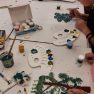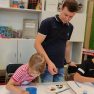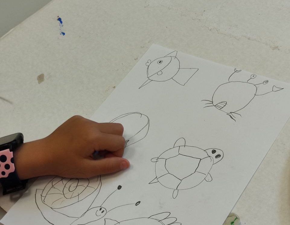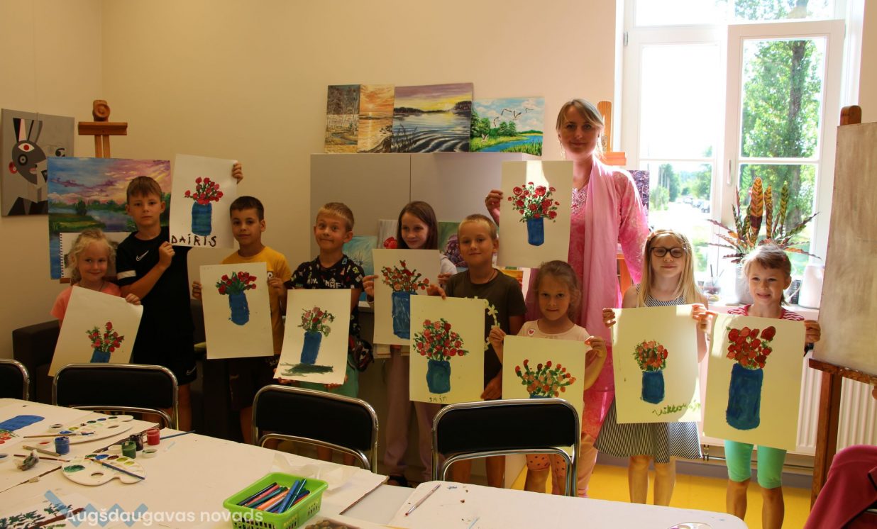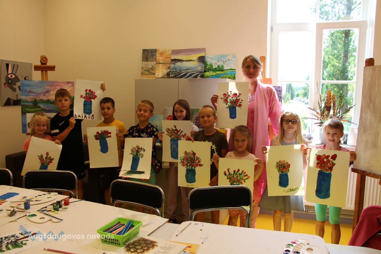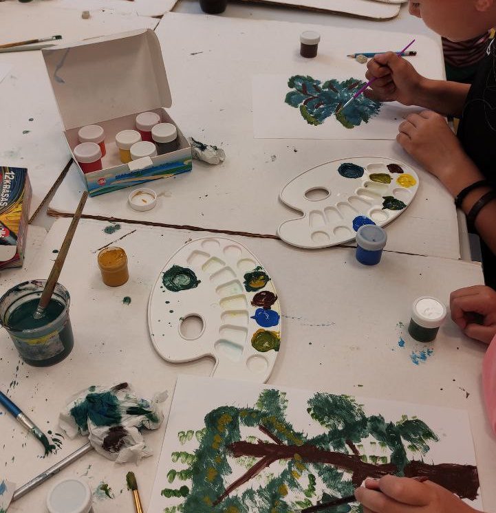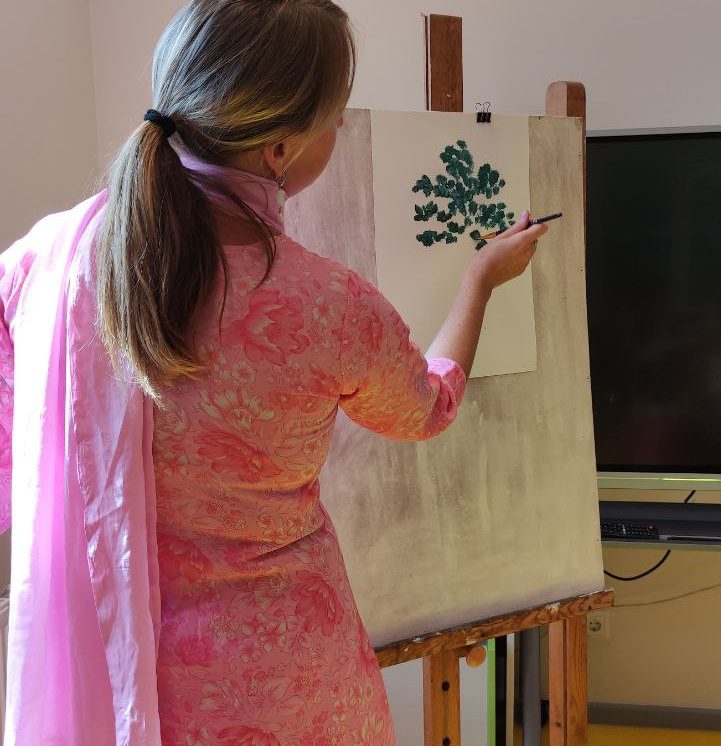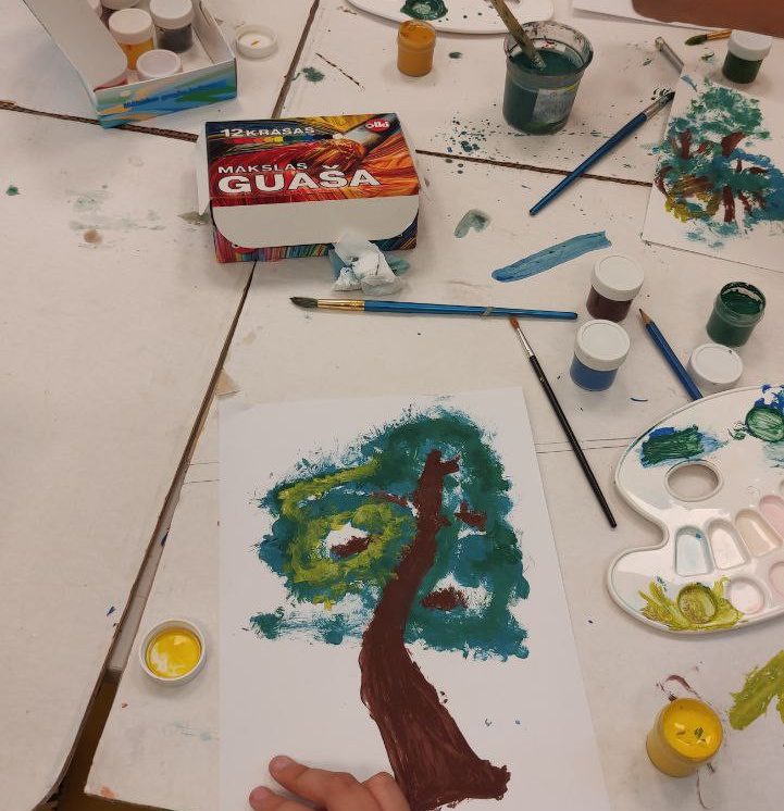 Iesākām ar parastiem uzdevumiem, zīmējot ar zīmuļiem. Tad pievienojām guašas krāsas un uzzīmējām kokus dažādās tehnikās. Uzzinājām, kā pareizi turēt otu, kādu otas izmēru izvēlēties konkrētam uzdevumam, iemācījāmies jaukt krāsas, veidojot visdažādākos toņus. Nodarbības pēdējā daļā uz papīra parādījās vāzes ar krāšņām puķēm un autoru parakstiem.