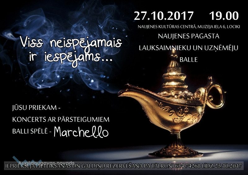 27. oktobrī plkst. 19.00 Naujenes kultūras centrā notiks ikgadējā lauksaimnieku un uzņēmēju balle. Pasaule ir pārāk apaļa, lai klusītēm sēdētu stūrī, tāpēc aicinām visus Naujenes pagasta lauksaimniekus un uzņēmējus jautri pavadīt kopā laiku ballējoties! Viss neiespējamais ir iespējams!