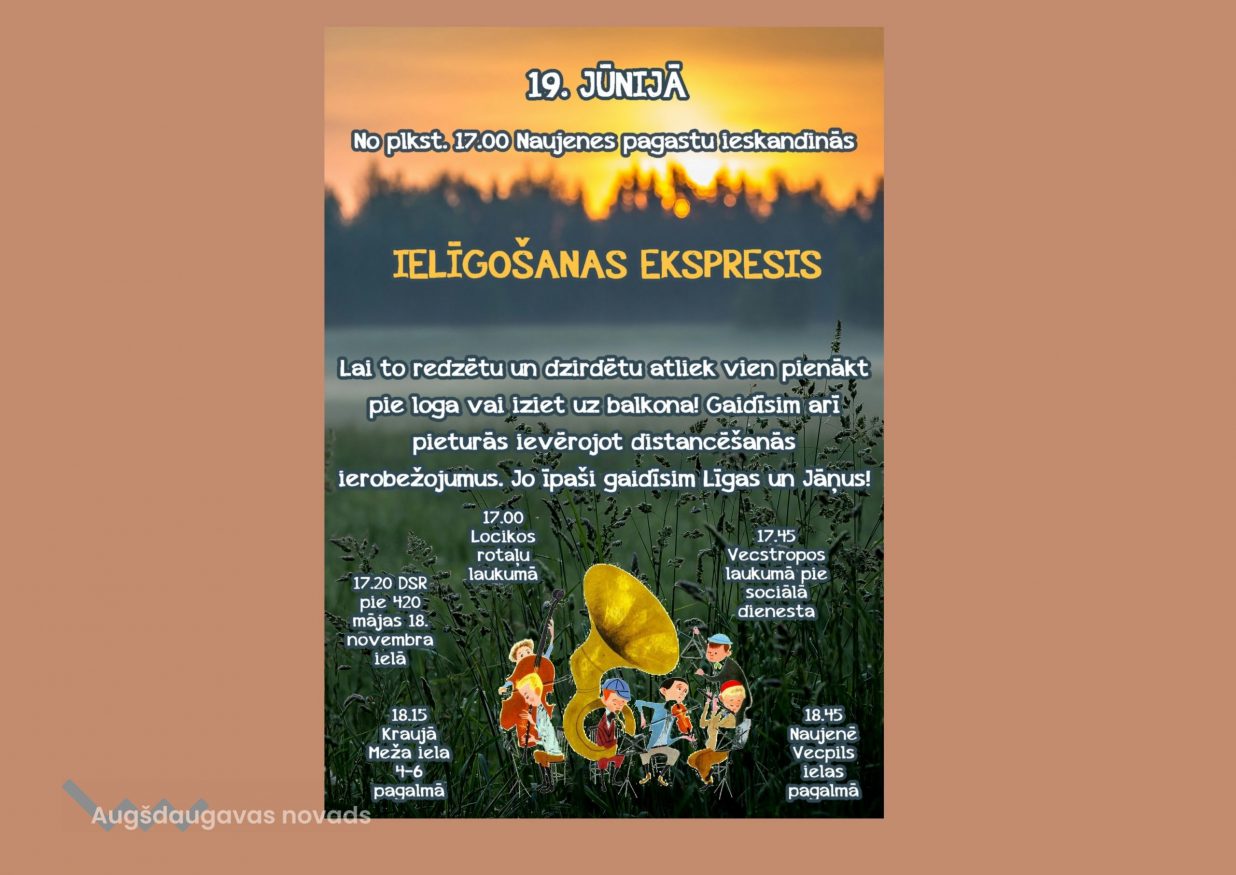 Naujenieši – ielīgosim! Aicinām visus sarūpēt Jāņu zāles, vainagus un ar skanīgu prātu sagaidīt ielīgošanas ekspresi, kas 19. jūnijā no plkst. 17.00 kursēs pa Naujenes pagastu!