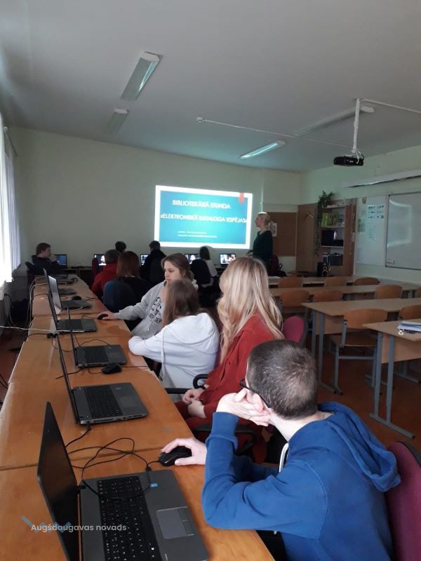Bibliotekāre Aiga pastāstīja un parādīja, kā var kļūt par bibliotēkas autorizēto lietotāju un kādas iespējas paveras bibliotēkas autorizētajam lietotājam. Mūsu audzēkņi uzzināja, ka, neizejot no mājam, var pagarināt grāmatas lasīšanas laiku, pasūtīt grāmatas vai stāties rindā pēc grāmatas, kura uz doto brīdi ir izdota citam lasītājām.