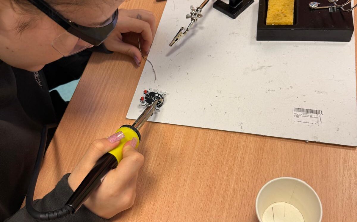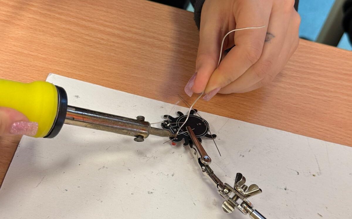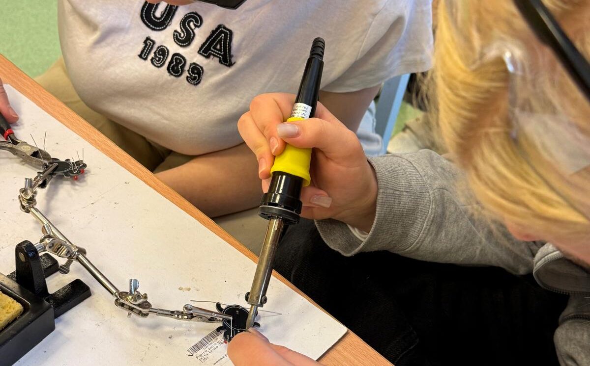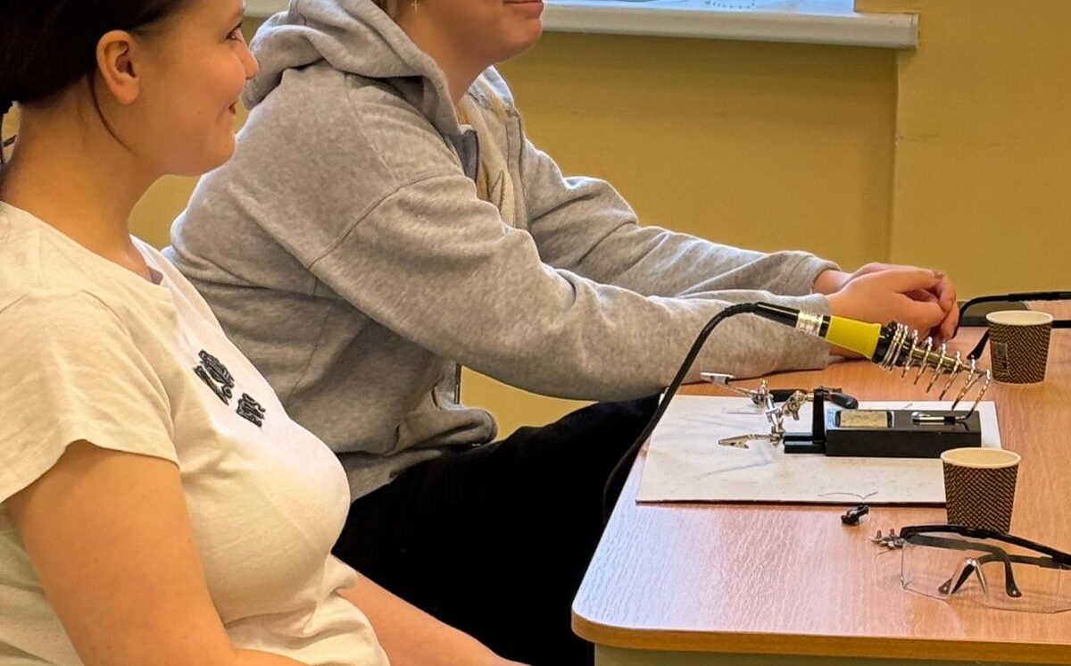 Darbojās praktiski: Ar lodāmuru rokās veidoja elektroniskās ierīces, stingri ievērojot drošības noteikumus.