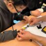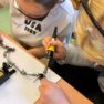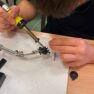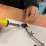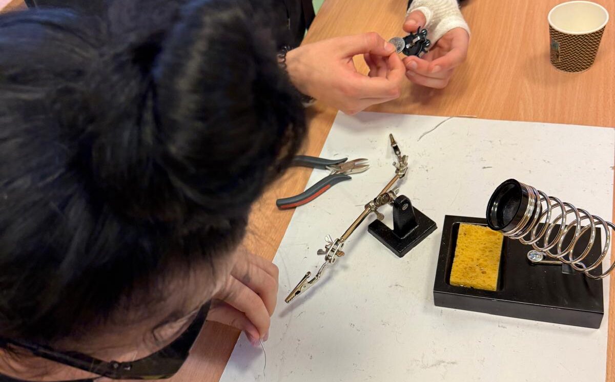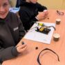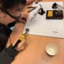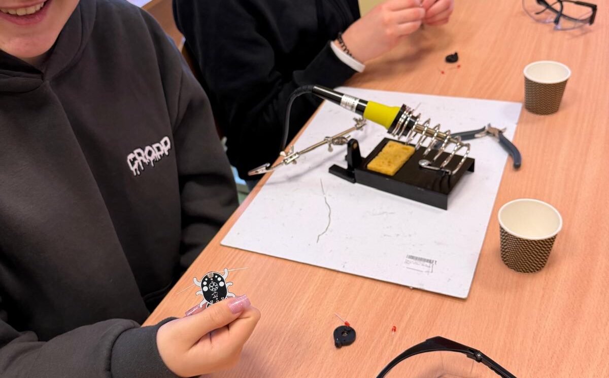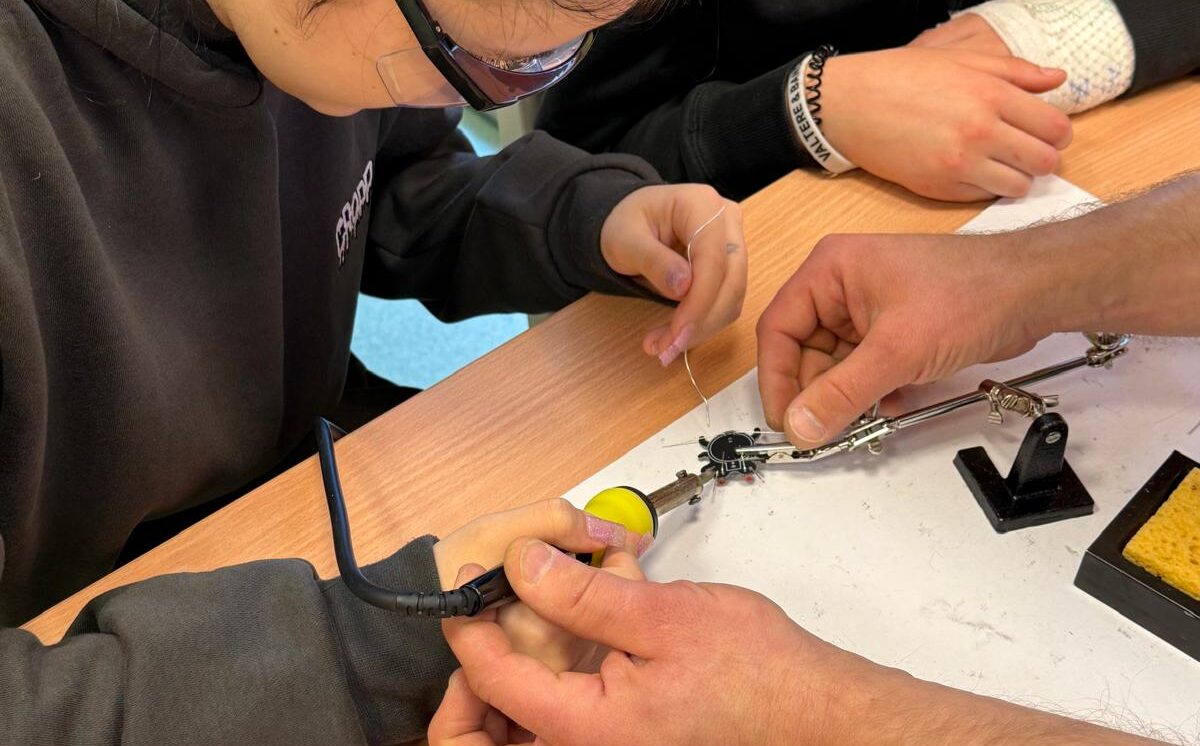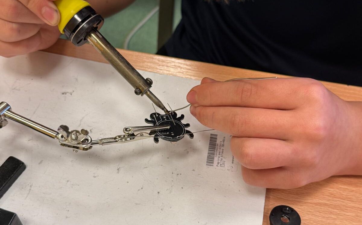 Darbojās praktiski: Ar lodāmuru rokās veidoja elektroniskās ierīces, stingri ievērojot drošības noteikumus.