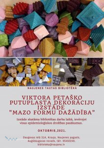 Naujenes tautas bibliotēkas izstāžu cikla ”Bibliotēkas vitrīnas stāsti” ietvaros, oktobra mēnesī skatāmā Viktora Petaško putuplasta dekorāciju izstāde “”Mazo formu dažādība! Vairāk par izstādi bibliotēkas emuārā https://naujenestautasbibliotka.blogspot.com/2021/09/bibliotekas-vitrinu-oktobra-stasts.html