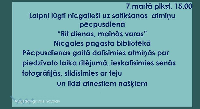 7. martā plkst. 15.00 Nīcgales pagasta bibliotēkā notiks nīcgaliešu tikšanās atmiņu pēcpusdienā “Rit dienas, mainās varas”.