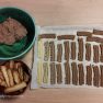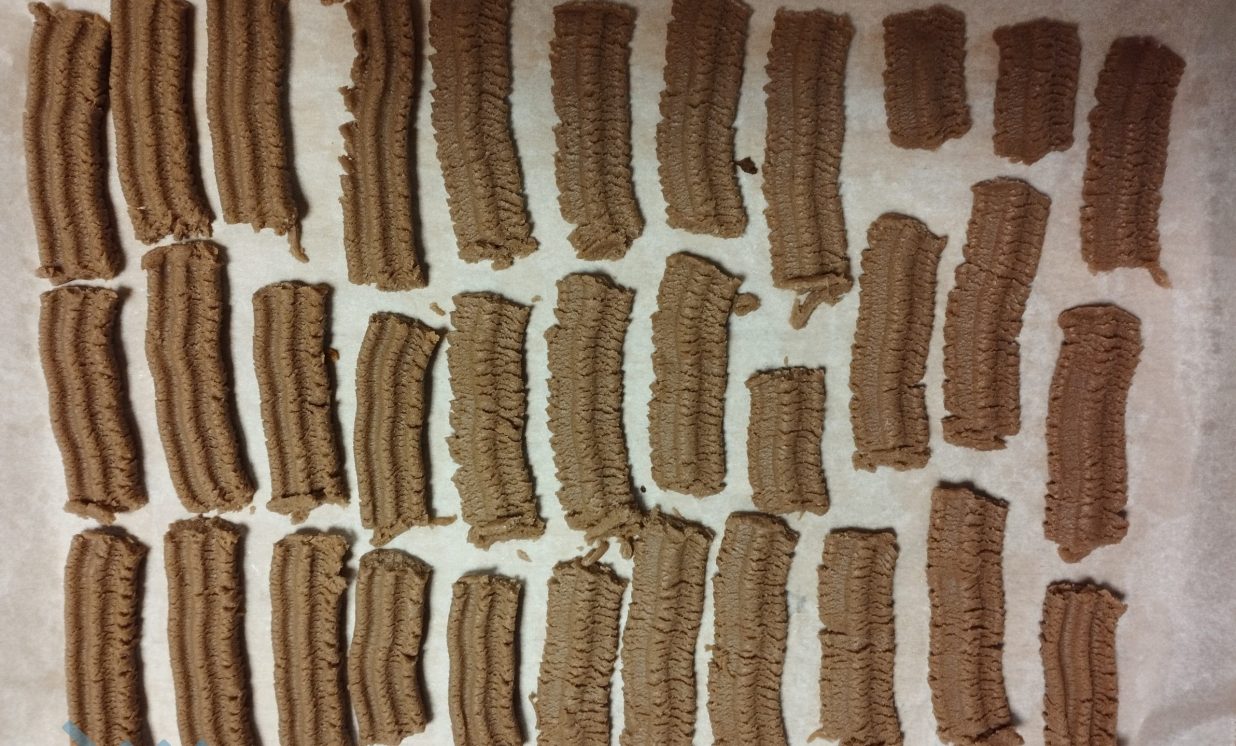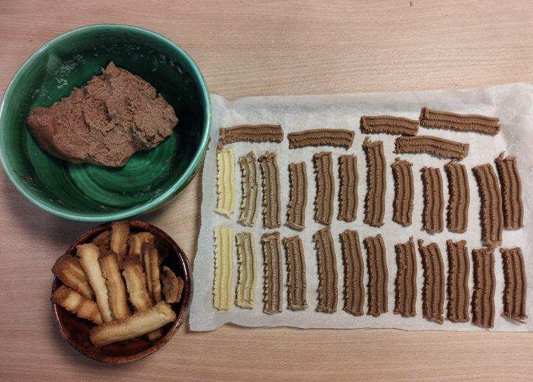 Mīkstam sviestam pievieno cukuru un ar karoti satrin. Pievieno olu dzeltenumus, sāli, majonēzi un samaisa. Pa daļām pievieno izsijātus miltus, cepamo pulveri un vanilīnu. Samīca viendabīgu mīklu. Tur ledusskapī 30 minūtes. Atvēsināto mīklu izmaļ caur gaļas maļamo mašīnu, izlaižot caur cepumu formēšanai paredzētu uzliku 4-5 cm. garus cepumiņus. Cep cepeškrāsnī 180 grādos zeltainus.