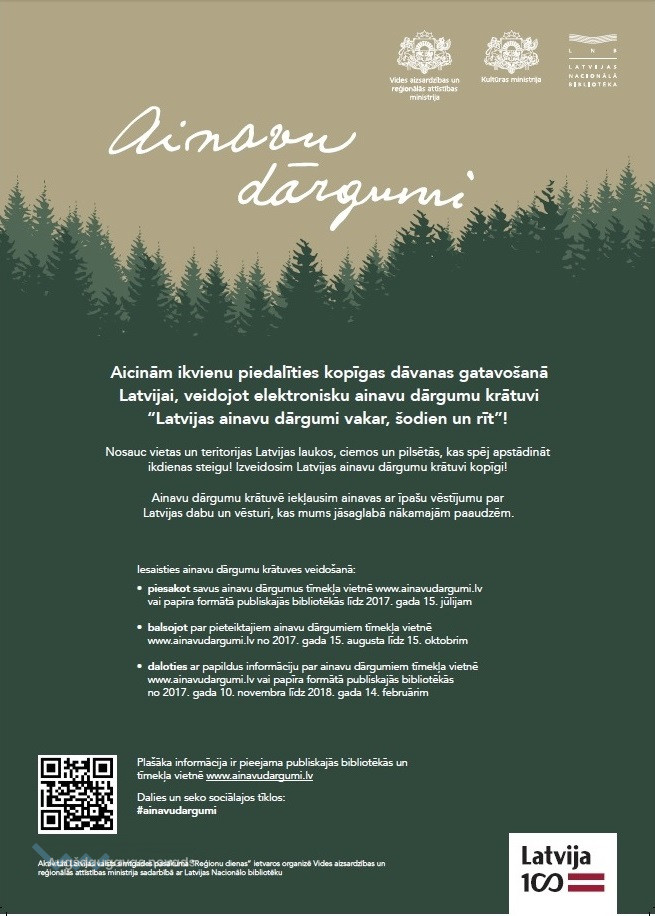 Vides aizsardzības un reģionālās attīstības ministrija (VARAM), Kultūras ministrija un Latvijas Nacionālā bibliotēka (LNB) aicina ikvienu Latvijas iedzīvotāju piedalīties kopīgas dāvanas gatavošanā Latvijai! Kopdarba rezultātā 2018. gadā tiks izveidota elektroniska Latvijas ainavu dārgumu krātuve "Latvijas ainavu dārgumi vakar, šodien, rīt", kurā tiks iekļautas sabiedrības vērtējumā nozīmīgas ainavas ar īpašu vēstījumu par Latvijas un tās reģionu dabu un vēsturi, kas jāsaglabā nākamajām paaudzēm.