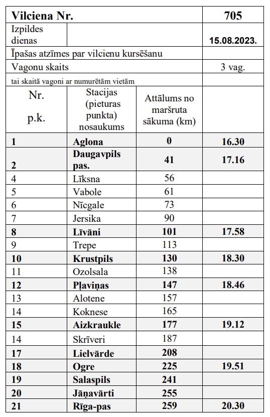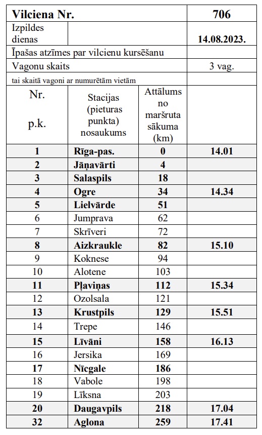 -2023.gada 14.augustā norīkots vilciens Nr.706 plkst.14.01 no Rīgas uz Aglonu; -2023.gada 15.augustā norīkots vilciens Nt.705 plkst.16.30 no Aglonas uz Rīgu.