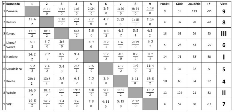 Pamatturnīra rezultāti: 1. vieta Naujene, 2. vieta Vabole, 3. vieta Kalupe, 4. vieta Ilūkste, 5. vieta Skrudaliena, 6. vieta Līksna/Svente, 7. vieta Višķi, 8. vieta Kalkūni, 9. vieta Demene.