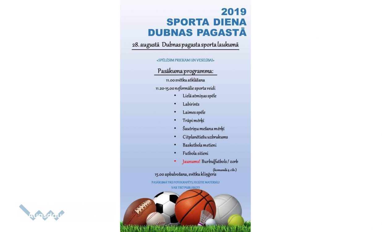 28. augustā no plkst. 11.00 Dubnas pagasta sporta laukumā, norisināsies sportisks pasākums “Sporta diena Dubnas pagastā 2019”