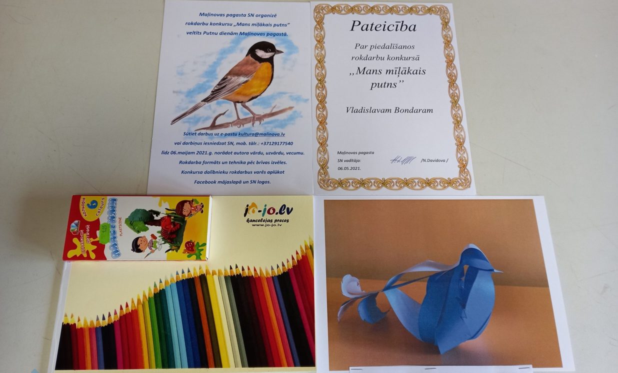 No 26. aprīļa līdz 6. maijam Maļinovas pagasta Saieta namā tika rīkots rokdarbu konkurss “Mans mīļākais putns”. Konkursā savus darbiņus iesniedza 13 bērni. Katrs izveidoja pa vienam rokdarbam, savukārt Fjodors Gurkins - divus rokdarbus. Rokdarbi tika izpildīti dažādās tehnikās - no aplikācijas un avīzes, plastilīna, diegiem, spalvām, pudelēm, čiekuriem un ozolzīlēm, koka detaļām.Visi dalībnieki saņēma pateicības un dāvanas.