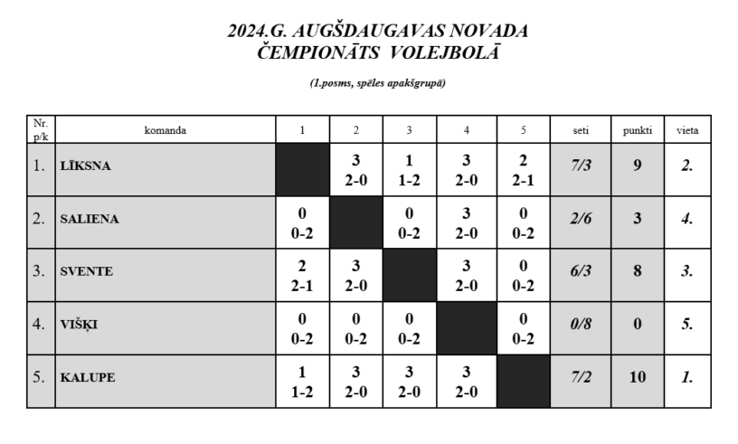 Finālā tikās Līksnas un Kalupes pagastu apvienību komandas. Pirmais sets aizritēja ar pārliecinošu kalupiešu dominanci laukumā, otrā setā Līksnas komanda atrada pretargumentus kalupiešiem un uzvarēja setu ar 25:23. Trešajā, izšķirošā setā savu nelielo pārsvaru pierādīja kalupieši un uzvarēja ar rezultātu 15:10, izcīnot uzvaru spēlē ar rezultātu 2:1, kļūstot par novada čempioniem un atstājot Līksnas komandu 2. vietā.