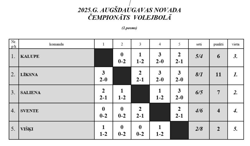 30. novembrī Sventes vidusskolas sporta zālē noslēdzās 2025. gada Augšdaugavas novada čempionāts volejbolā. Šogad piedalījās piecas komandas Višķu, Līksnas, Salienas, Kalupes un Sventes pagastu apvienību komandas.
