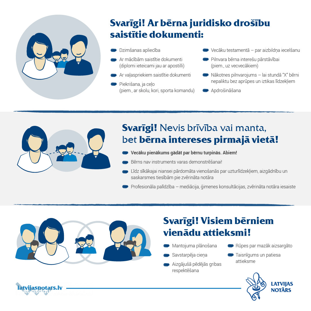 Latvijas Zvērinātu notāru padome, kas rīko Notāru dienas, šogad aicinās sabiedrību domāt par bērnu juridisko drošību un vienmēr turēt bērnu intereses pirmajā vietā. Notāri aicinās cilvēkus izzināt, kas ir nepieciešams, lai viņu bērni būtu pilnībā juridiski nodrošināti dažādām situācijām, ko ģimene var piedzīvot, bet jo sevišķi – vecākiem šķiroties.