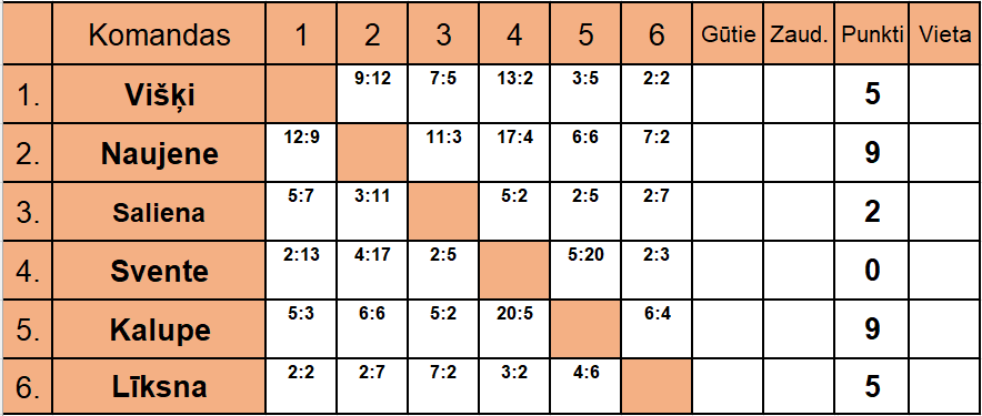 Pašlaik ir noslēdzies pirmais aplis. Līderos izvirzījušās 2 komandas ar vienādu punktu skaitu - Kalupe un Naujene, 3. un 4. vietu ar vienādu punktu skaitu dala Višķi un Vabole. Nākamās čempionāta spēles notiks 29. martā, bet turnīrs noslēgsies 5. aprīlī.