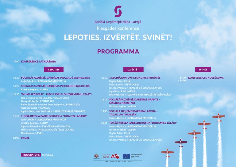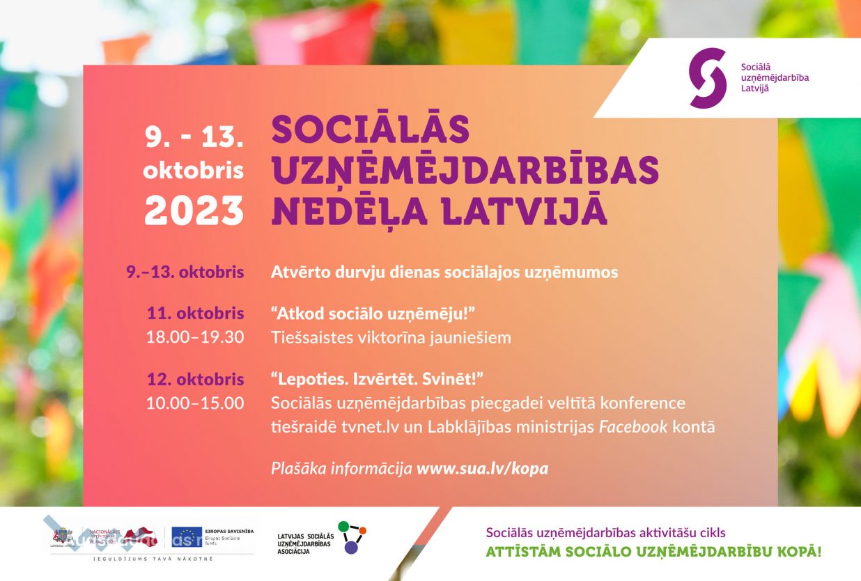 Savukārt 12. oktobrī tiešsaistē būs vērojama sociālās uzņēmējdarbības nozares piecgadei veltītā konference “Lepoties. Izvērtēt. Svinēt!”, kas ļaus atskatīties un izvērtēt paveikto un kopīgās sarunās iezīmēt nozares tālāko attīstību.