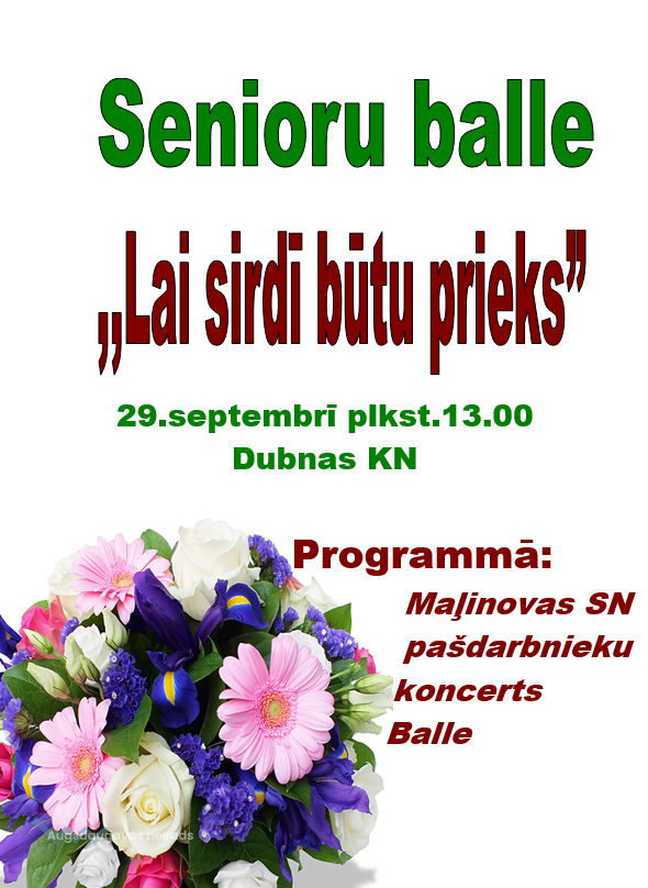 "Lai sirdī būtu prieks”, tā seniori šogad ir nosaukuši Senioru balli, kura notiks Dubnas pagasta kultūras namā 29.septembrī plkst.13.00. Uz pasākumu tiek aicināti visi Dubnas pagasta seniori, gan tie, kas sen ir pensionējušies, gan priekšlaicīgi pensionējušies, gan tie, kas saņem citu valstu pensiju un pensionāri - invalīdi.