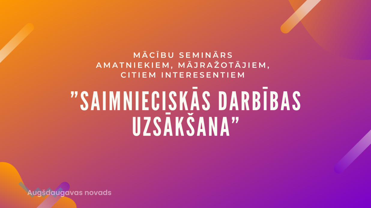 Daugavpils novada kultūras centrā ”Vārpa”, Dobeles ielā 30, Daugavpilī Valsts Kultūrkapitāla fonda Latgales kultūras programmas projekta ”Mācību semināri Latgales reģiona kultūras darbiniekiem” ietvaros 2019.gada 4.decembrī no plkst. 10.00 līdz 15.00 notiks mācību seminārs. Tas ir domāts amatniekiem, mājražotājiem un citiem interesentiem. Semināra nosaukums ir ”Saimnieciskās darbības uzsākšana”. Semināra dalībnieki tiks iepazīstināti ar individuālo komersantu un pašnodarbināto personu grāmatvedības uzskaites īpatnībām, par iedzīvotāju ienākuma nodokļa aprēķināšanu no saimnieciskās darbības, valsts sociālās apdrošināšanas obligātajām iemaksām, mikrouzņēmuma nodokļa uzskaites kārtību, kā arī par darba apmaksas uzskaites veidiem (autoratlīdzības līgums, uzņēmuma līgums, darba līgums). Lektore iepazīstinās ar pamatlīdzekļu uzskaites veidiem, kā arī saimnieciskās darbības ieņēmumu un izdevumu uzskaites veikšanu, u.c. jautājumiem. Uz semināru aicināti amatnieki, mājražotāji, kā arī citi interesenti, kas vēlas uzsākt savu saimniecisko darbību, taču aicināti ir arī tie, kuri jau to dara, ja tiem ir nepieciešamība papildināt zināšanas. Pēc lekcijas notiks individuālās konsultācijas, ja tādas būs nepieciešamas. Seminārs ir bezmaksas, taču vietu skaits ir ierobežots. Iepriekšējā pieteikšanās ir obligāta. Kontakti pieteikumiem: terezija.ubele@dnkp.lv, tālr.: 654 35512, 28379611.